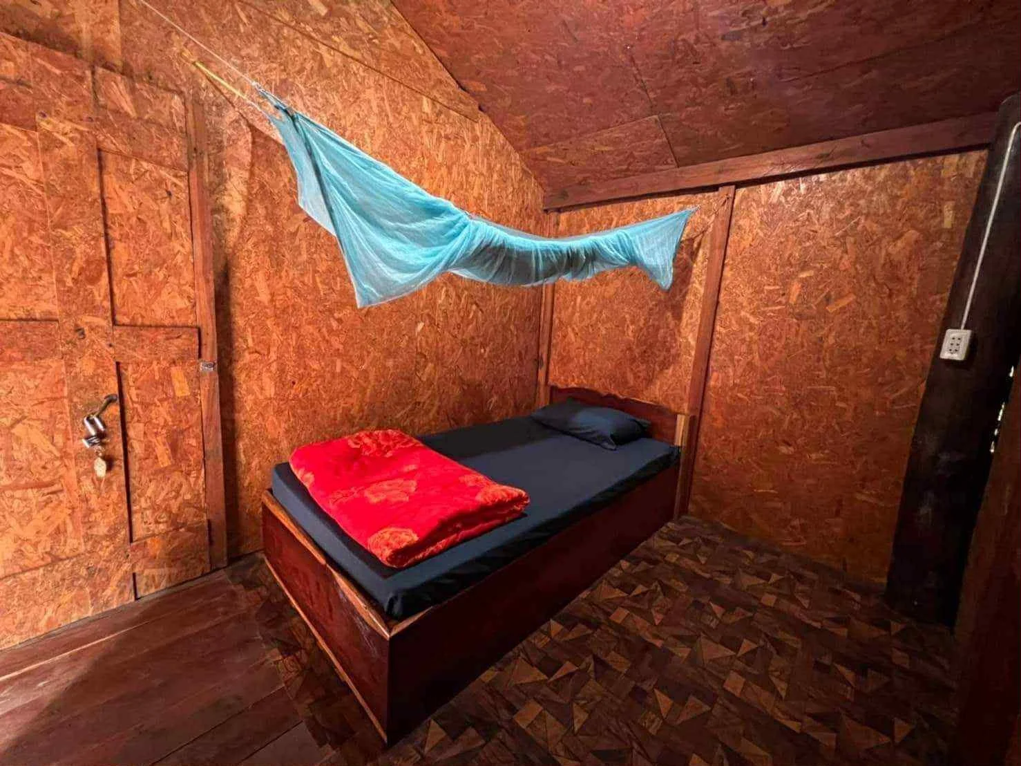 Each room is local Thai style living Mattress on the floor with bed linen, a fan and mosquito nets. The bathrooms are a shared toilet block, with shower heads and western toilets. There are 2 sinks with Mirrors outside the toilet block.