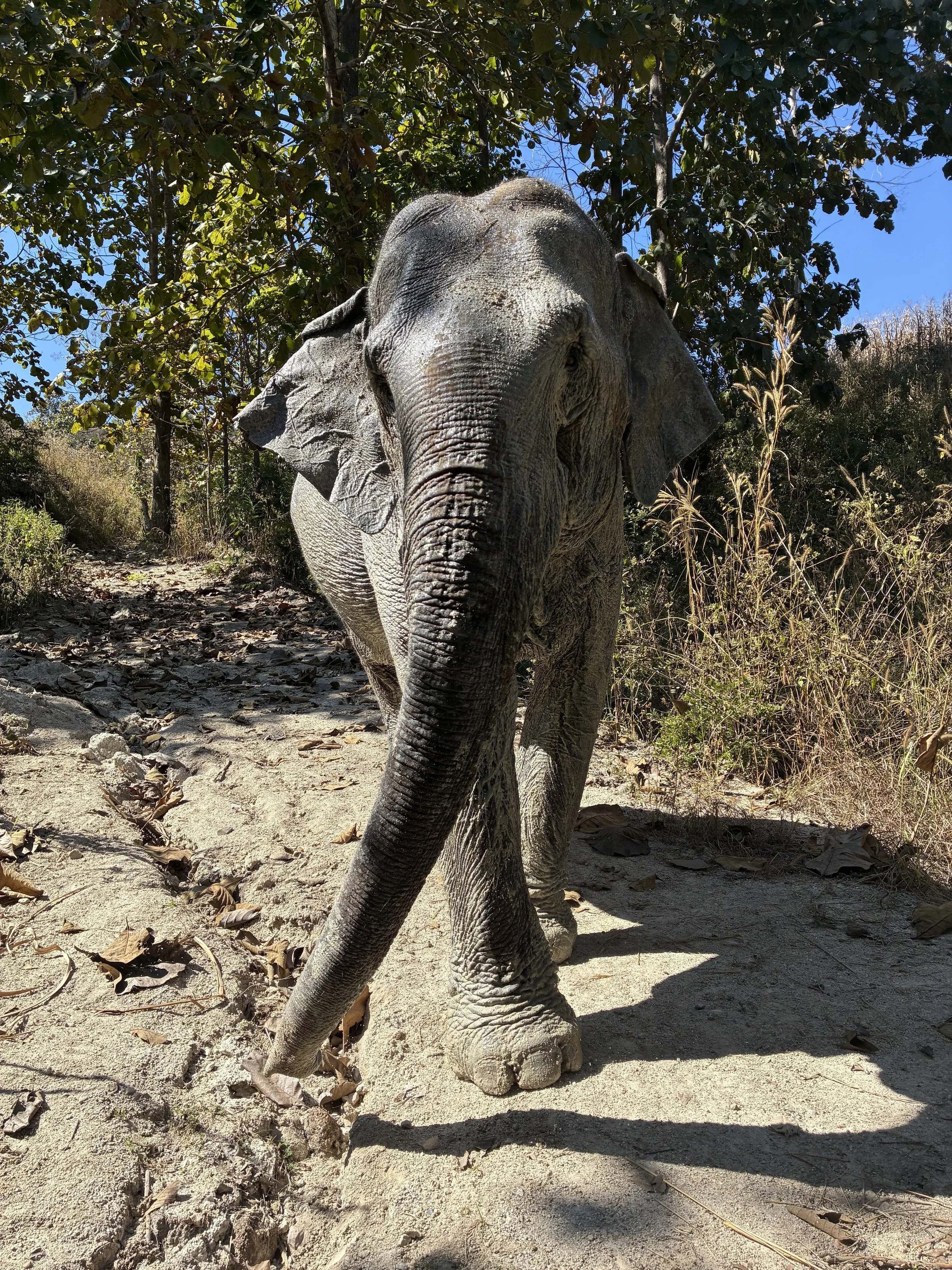 Jasmine worked as a logging elephant her entire life, living high in the mountains and hauling heavy logs to build temples, houses, and other structures. We had followed Jasmine and her mother for several years. They remained together from the time Jasmine was a baby, and we had hoped to retire them both to BEES. Sadly, her elderly mother passed away during the winter season in December 2024.